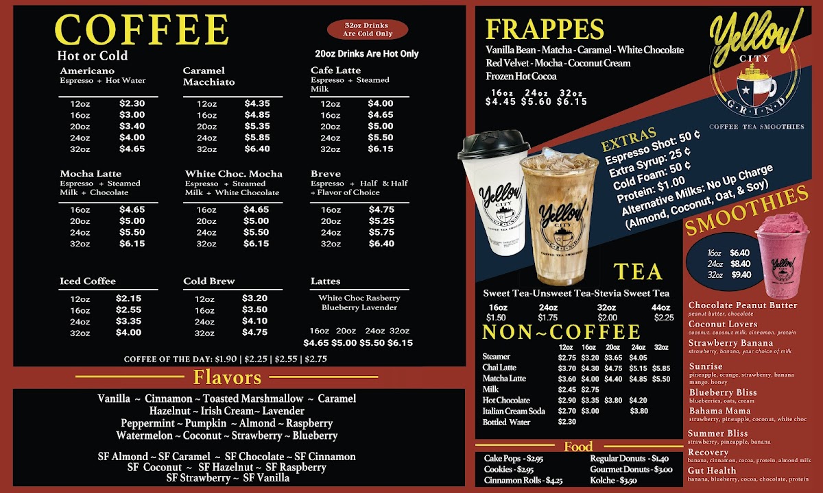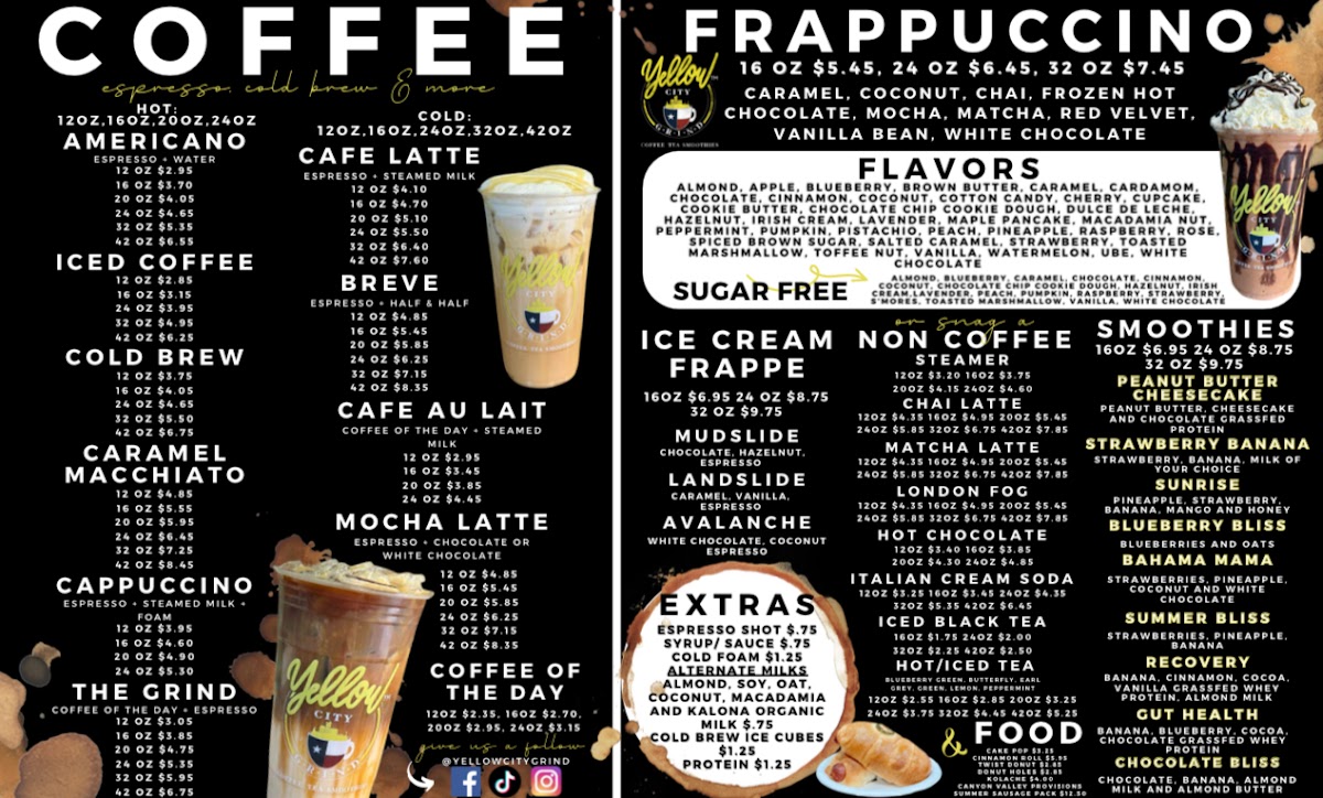 Welcome to Yellow City Grind, Amarillo's beloved coffee haven, strategically located at 4410 Bell St. This charming café prides itself on serving high-quality brews crafted by a passionate team. The menu features delightful options like the seasonal Pumpkin Cold Brew and the signature Lav Haze Latte (T.Swift), catering to both cold and iced coffee enthusiasts. Patrons rave about the deliciousness and creativity found in each cup, along with the cozy ambiance perfect for work or relaxation.